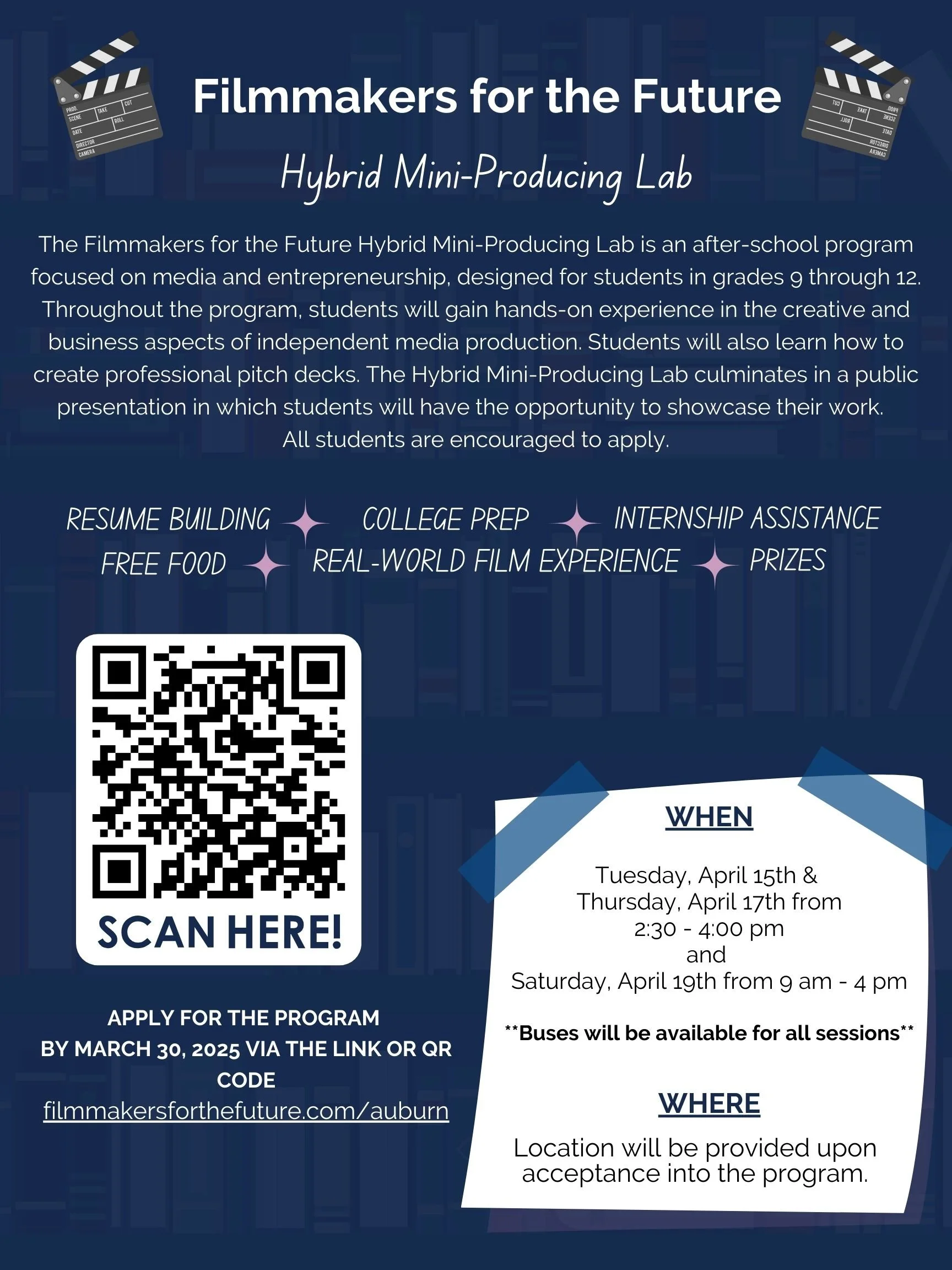 The Filmmakers for the Future Hybrid Mini-Producing Lab is an after-school program focused on media and entrepreneurship, designed for students in grades 9 through 12. The program culminates in a public presentation where students will showcase their work. Please apply for the program using the link below!